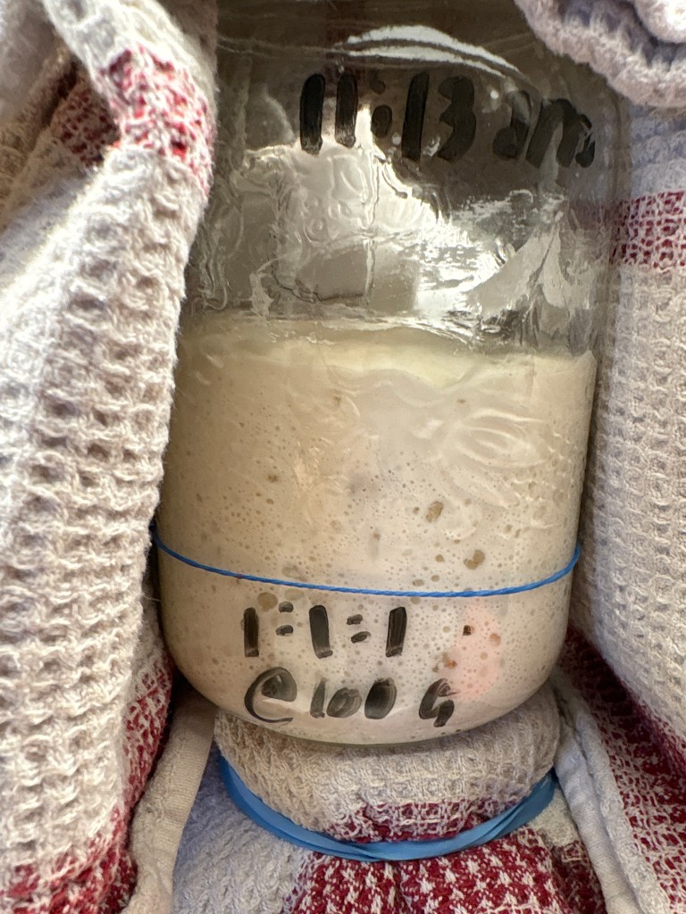I fed my starter at 11:15 am, and it was ready by about 4pm. I decided to use a giant tub to make the dough. (Because that’s what the cool kids on the internet do) ((those are professional bakers making 30 loaves not a microbaker making one loaf))